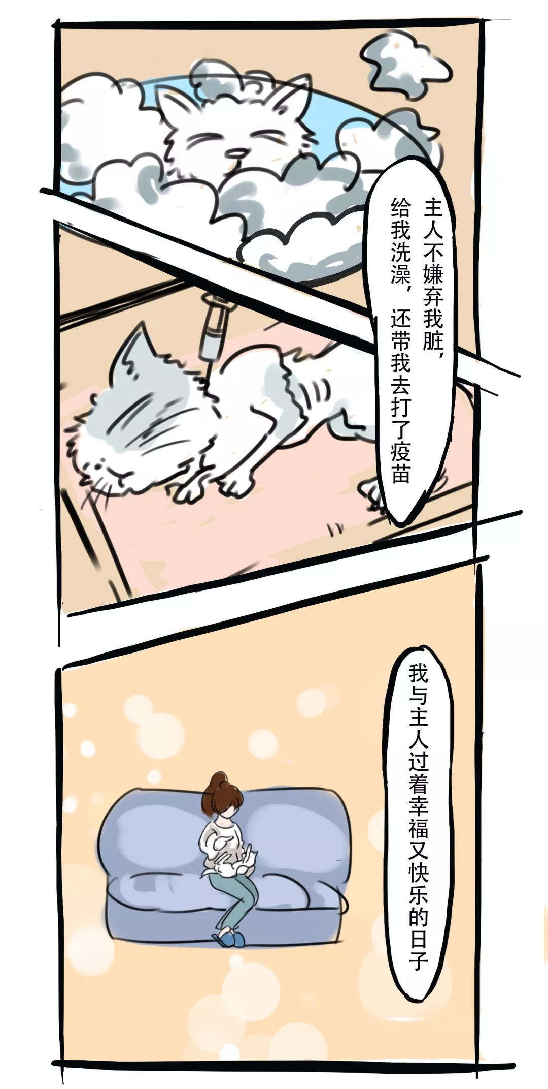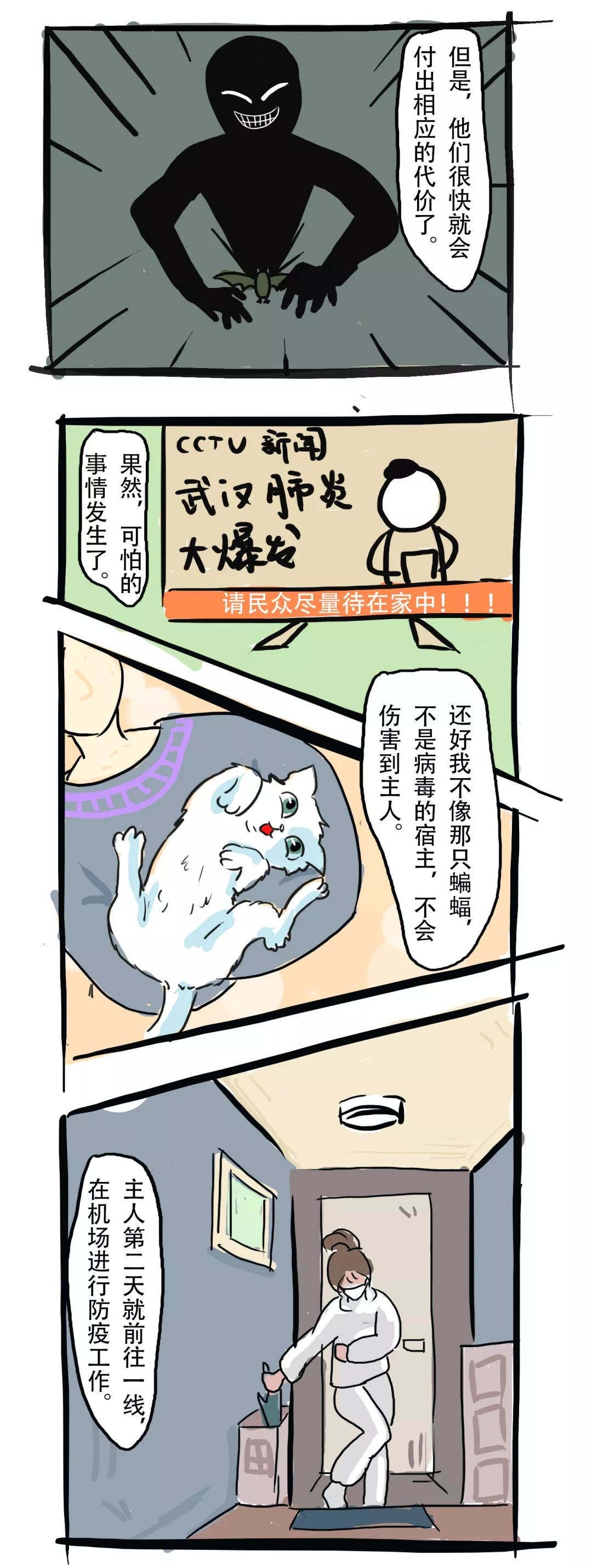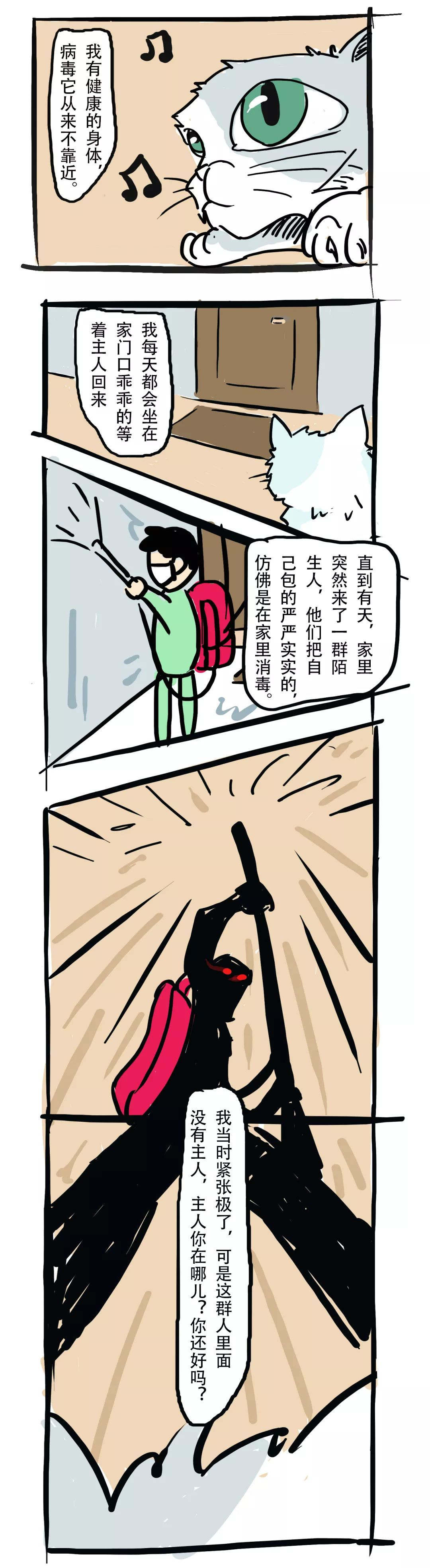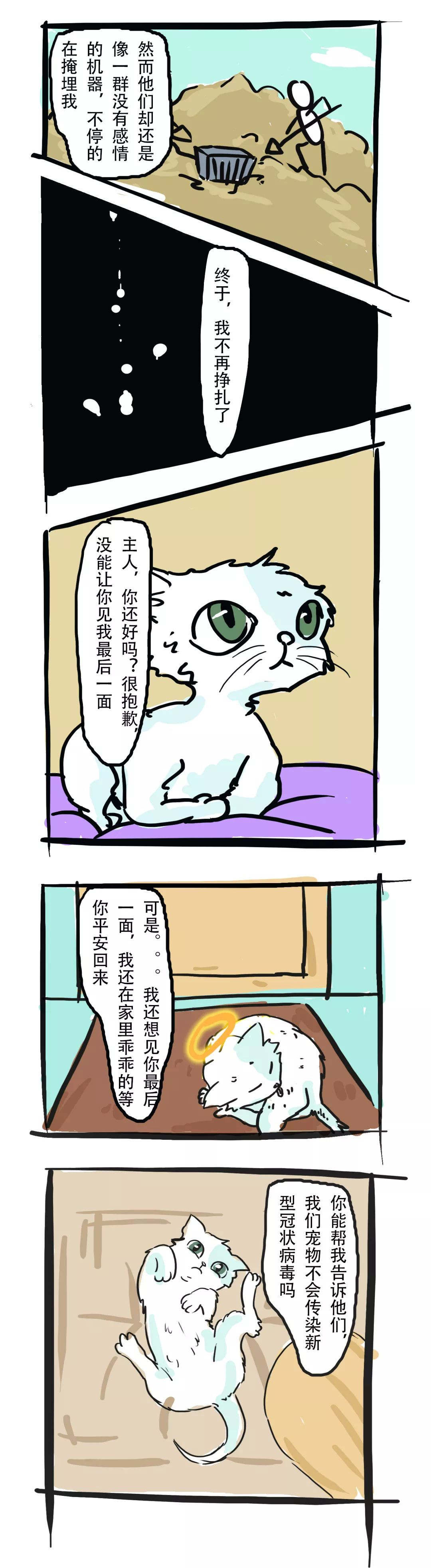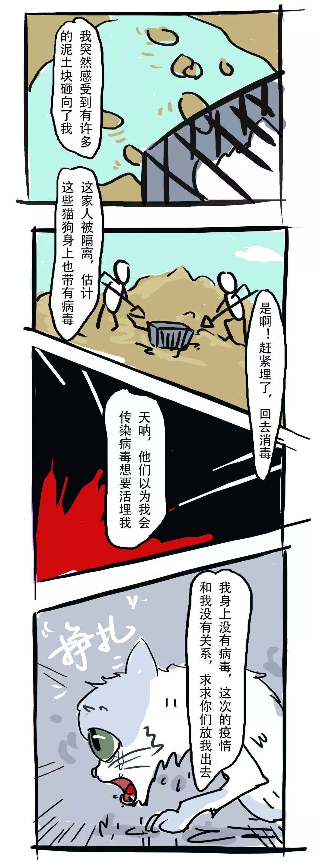 还有更多残忍的新闻:有人焚烧猫狗、从阳台上丢下猫咪致死亡、无数滞留猫狗面临死亡局面….每次看到都觉得心痛不已。为此我们画了一组漫画,试图还原啾咪的内心独白,想借此呼吁更多人:每一个生命都值得尊重和爱护,都不应被轻易放弃。希望大家可以理智抗疫,看到小动物起码不要伤害它们,它们并不是病毒的宿主!