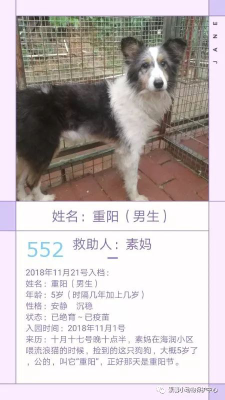 “552重阳”十月十七号晚上十点半,素妈在海润小区喂流浪猫的时候,捡到的这只狗狗,大概五岁了,公的,叫它”重阳“,正好那天是重阳节。