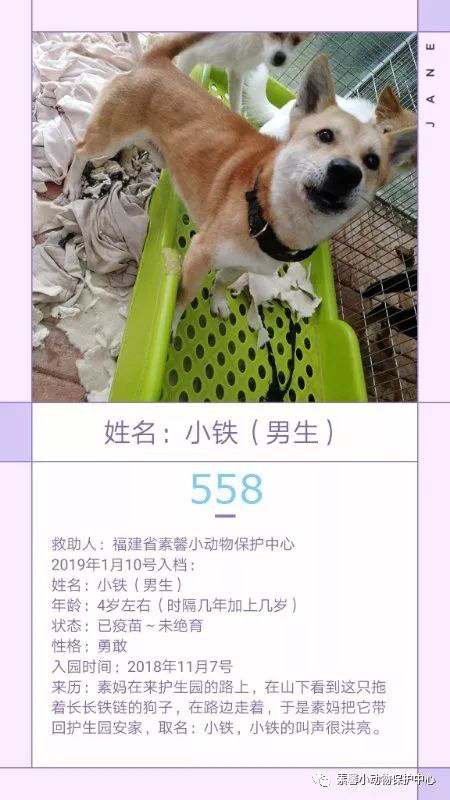 “558小铁”素妈在来护生园的路上,在山下看到这只拖着长长铁链的狗子,在路边走着,于是素妈把它带回护生园安家,取名:小铁,小铁的叫声很洪亮。