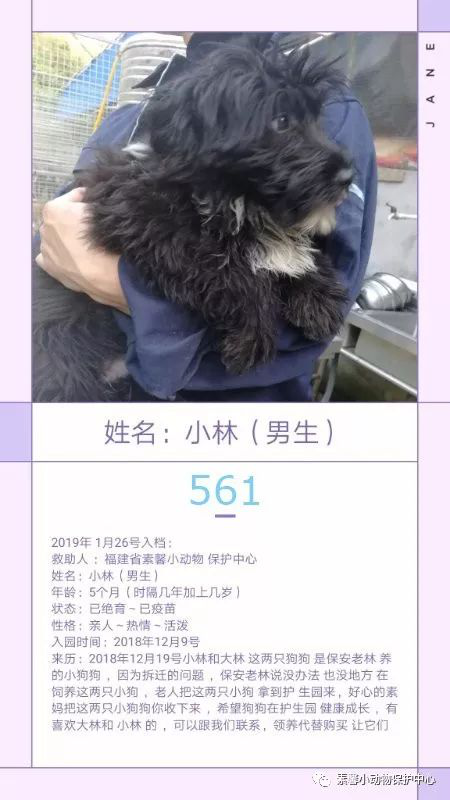 “561小林”2018年12月9号小林和大林这两只狗狗是陵园保安老林养的小狗狗,因为拆迁的问题,保安老林说没办法也没地方再饲养这两只小狗,老人把这两只小狗拿到护生园来,好心的素妈把这两只小狗狗收下来,希望狗狗在护生园健康成长,有喜欢大林和小林的,可以跟我们联系,领养代替购买,让它们有个温暖的家。