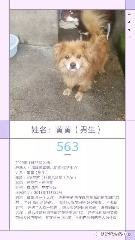 “563黄黄”黄黄是一个大叔,连着笼子遗弃在我们护生园门口的,当时我们刚好碰见,就叫大叔好好回家喂养,不要遗弃它,还送了大叔一箱肉,叫大叔带回家好好喂养,没想到最后大叔过后还是把狗狗遗弃在护生园门口,这样我们就把黄黄带回犬舍内安家,其实黄黄可乖啦,不明白原来的主人为什么遗弃它。