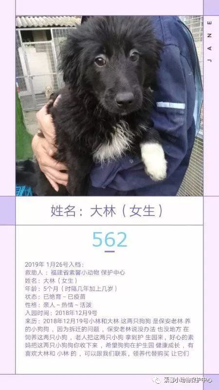 “562大林”2018年12月9号小林和大林这两只狗狗是陵园保安老林养的小狗狗,因为拆迁的问题,保安老林说没办法也没地方再饲养这两只小狗,老人把这两只小狗拿到护生园来,好心的素妈把这两只小狗狗收下来,希望狗狗在护生园健康成长,有喜欢大林和小林的,可以跟我们联系,领养代替购买,让它们有个温暖的家。